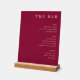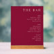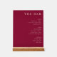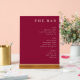 This elegant wedding menu card features a sophisticated maroon background with crisp white text, creating a striking contrast. The layout is clean and organised, showcasing sections for beer, wine, and spirits in an easy-to-read serif font. Its minimalist design emphasizes typography, conveying a refined and modern aesthetic perfect for any upscale event. Ideal for weddings or formal gatherings, this menu exudes class and simplicity, making it a versatile choice for those seeking a timeless look.