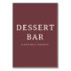 This elegant wedding tabletop sign features a simple, centered layout with ample negative space on a rich maroon background. The design utilizes clean, modern typography with bold serif fonts in off-white or light beige for the main text "DESSERT BAR" and a friendly invitation below. Its minimalistic style conveys sophistication and warmth, making it perfect for guiding guests to the sweet treats at your event. The inviting tone and classic color palette ensure this sign is both stylish and functional for any dessert bar setup.