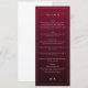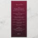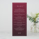 This elegant wedding menu features a sophisticated layout with a deep maroon background and crisp white text, creating a luxurious and refined atmosphere. The design employs a mix of cursive and serif fonts to highlight the different sections, such as Starters, Salad, Main Course, and Dessert, ensuring clarity and visual appeal. Each dish is presented in an organized manner, emphasizing the culinary offerings without any distracting graphics or patterns. Perfect for high-end dining experiences, this minimalist yet stylish menu captures the essence of sophistication and celebration.