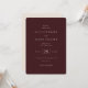 This elegant wedding invitation features a deep maroon background with a clean, modern layout that emphasizes typographic hierarchy. The design uses a mix of serif and script fonts to create a sophisticated and inviting look, perfect for formal celebrations. With ample negative space, the text is easy to read and highlights key details like the date and venue. The overall mood is classic and refined, making it ideal for couples seeking a timeless aesthetic for their special day.