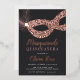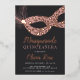 Elegant masquerade ball invitations for your quinceanera celebration feature an ornate mask in dusty rose pink and rose gold foil, adorned with a feather. Personalise with your party details beneath in calligraphy script and block lettering.
