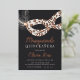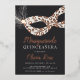 Elegant masquerade ball invitations for your quinceanera celebration feature an ornate mask in off white and rose gold foil on a rich charcoal black background, adorned with a feather. Personalise with your party details beneath in calligraphy script and block lettering.