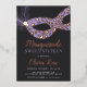 Elegant masquerade ball invitations for your sweet sixteen birthday celebration feature an ornate mask in orchid purple and rose gold foil, adorned with a feather. Personalise with your Sweet 16 party details beneath in calligraphy script and block lettering.