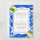 Watercolor Lemons. Mediterranean tile. Wedding Invitation. Floral Mediterranean floral element on the back. Blue Frame.