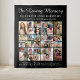 Elegant black memorial tapestry celebrating the life and times of a deceased loved one featuring "In Loving Memory" in a stylish white script, a thirty photo collage to commemorate their life, family, pets, friends, achievements, travels and joys, their name and birth and death dates. Personalise words of memorial at the bottom (initially set to "Your life was a blessing, your memory a treasure. You are loved beyond words and missed beyond measure").