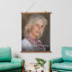 Elegant memorial photo portrait hanging tapestry to remember and celebrate the life of a departed loved one. Their photo is overlayed with "In Loving Memory" in white script and their name and birth and death dates.