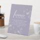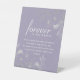 Elegant, bohemian, vintage dusty purple lavender wedding memorial tabletop sign with faux silver floral lace and simple calligraphy script.