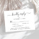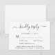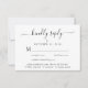 Elegant wedding RSVP enclosure card featuring "kindly reply" in a calligraphy script with swashes, simple and modern typography, personalised menu entree options and your names and wedding date joined together by a heart on the back.
