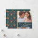 An elegant golden and deep blue damask pattern on the background, featuring your favourite photo and a cute wreath as illustration. Written "Merry Christmas" in golden letters.