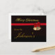 Beautiful Christmas greeting postcard with golden Merry Christmas text with green highlights on a black background. A faux red ribbon with golden bells and a red bow runs across the design. Very elegant Christmas design for your holiday items.