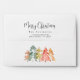 Simple and elegant Christmas season envelope for your holiday correspondence. The back features a watercolor abstract of pine trees in muted sage green, red, gold and orange, "Merry Christmas" in a stylish script and your return address in modern typography.