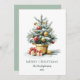 Our wonderful little Christmas tree in a gold pot is elegant for the holiday season, but somehow at the same time is cute as can be. We love the shiny gold and red ornaments, dusting with snow, and red-ribboned bows on presents ready to be given. All done in watercolor of vintage origin, but you wouldn’t know it because it looks so modern and trendy. We hope you love it too and will enjoy sending this “Merry Christmas” flat holiday card to your beloved relatives and friends this wintertime.