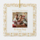 Celebrate the season with this beautiful Christmas ornament featuring an intricate, gold foil-inspired poinsettia and pine evergreen border on a white background. Both sides highlight your favorite family photo, ready to send with love to family and friends. Personalized with your family picture, name and year, this festive design perfectly captures the cozy spirit of Christmas in an elegant and classic style.