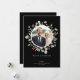 This elegant and festive holiday photo card features a beautiful watercolor wreath of holly, eucalyptus, and berries over a chic black background. The photo cut out is round. The editable greeting on the front says "MERRY & MARRIED". The back of the card is the same black background colour. You can also add another photo and/or additional text to the back. The background colours and text colours are all customisable.