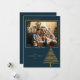 This gorgeous flat holiday card is an excellent choice for anyone wanting to send a Christmas family photo card to their loved ones this holiday season. The design features one custom central image on a blue background decorated with a beautiful and thin gold frame.