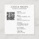 The back has a QR code, and in clean text is the business name, job title, contact details, website, physical address, and socials in a minimalist style.