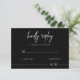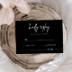 Invite your guests to respond in style with this elegant minimalist black wedding RSVP card. Featuring a sleek black background, modern white script, and clean typography, this reply card perfectly complements contemporary, black-tie, or monochrome wedding themes. Customise with your names, reply date, and meal options for a fully personalised touch. Pairs beautifully with matching invitations, seating charts, and wedding stationery for a cohesive look. Printed on premium paper with envelopes included, making it easy for guests to send their responses.