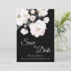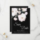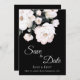Delicate white roses on the top left corner of this elegant save the date card with black background. Wedding save the date details in light grey typography for contrast. Upload your favourite photo to complete design and make it unique.