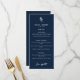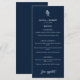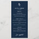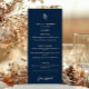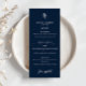 Add a refined and cohesive touch to your reception tables with this navy blue botanical wedding menu, designed to complement elegant and modern wedding themes. Featuring a deep navy background accented by a delicate white botanical sprig, this vertical menu card offers a clean and structured layout for listing your wedding meal courses in style. With distinct sections for starters, main courses, and desserts, this customisable menu is perfect for showcasing your personalised wedding dinner or buffet selections. The classic navy and white colour palette coordinates beautifully with formal table settings, floral centerpieces, and matching wedding stationery from the same collection. Whether used at a seated dinner or plated reception, this botanical wedding menu enhances your guests' dining experience while adding a polished, design-forward element to your tablescape. Ideal for upscale weddings, city venues, or romantic garden receptions, it brings elegance and personalisation to every place setting.