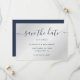 Elegant navy blue and silver wedding save the date card with a modern script font. Matching items available.