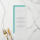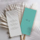 For the couple seeking simplicity and sophistication, our minimalist wedding menu is the perfect choice. Designed to suit our elegant minimalist wedding suite, this elegant design maintains an elegant almost white-grey background, with the couple’s initials elegantly centered on the top half, making excellent use of negative space. The wedding menu is thoughtfully placed on the bottom half, maintaining a clean and stylish look. The back of the menu features a stunning teal background with the couple’s initials tastefully printed in the center. This design is ideal for those who appreciate understated elegance and modern minimalism.