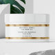An elegant minimalist cosmetics jar label with a white background, black text, and a faux gold border.
