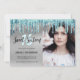 This modern invitation design features faux mint dripping glitter, silver metallic texture and elegant calligraphy font. Add your favourite photo.