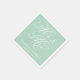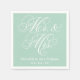 A fresh wedding napkin featuring "Mr. and Mrs." in ornate white flourished script on a soft mint green background. The couple's names and wedding date are printed below in clean white type, creating a personalised monogram accent. A lovely complement to garden weddings, spring receptions, or pastel-themed celebrations. All text is customisable.