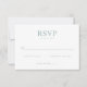 This elegant wedding RSVP card features a minimalist design with ample negative space, creating a clean and sophisticated look. The soft mint green text contrasts beautifully against the light grey background, enhancing readability while maintaining an understated charm. The layout includes customisable fields for names and attendance numbers, ensuring personalisation without compromising on style. Perfect for conveying formality and anticipation, this card is ideal for couples seeking a modern yet classic touch for their special day.
