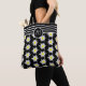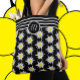 An elegant black and white tote bag with a floral pattern and four horizontal stripes at the top . Personalise it with an initial . This design is also available in cyan , light green and red .
