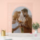 Create your own acrylic wedding sign featuring one of your photos in an arch shaped frame alongside custom names, date and other wedding details in modern typography on transparent background. A sleek and minimalist way to greet guests on your special day.