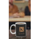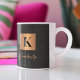 Stylish modern luxury monogram initial and signature script name personalised coffee mug featuring a faux metallic gold copper square with initial letter and your name over a black leather like (PRINTED TEXTURE) background.