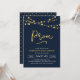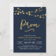 Elegant Prom invitation featuring strings of lights and the word "Prom" in faux gold foil against a dark blue background. Card has s a matching pattern back side.