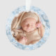 Modern personalized First Christmas ornament which features beautiful snowflake wreath, faux blue marble texture and elegant handwritten script lettering on the back side. Personalize the product with the name, the year and two of your favorite photos. This is a perfect gift for grandparents or great - grandparents.