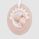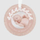 Modern personalised First Christmas ornament which features beautiful white wreath and faux copper rose gold glitter texture. Personalise the product with the name, the year and two of your favourite photos.