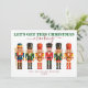 Add a festive twist to your holiday greetings with our Elegant Modern Funny Colourful Nutcracker Christmas Holiday Card. This delightful design features a row of 6 colourful and funny Nutcrackers against a crisp white background, creating a playful yet sophisticated look. The cheerful phrase "Let's get this Christmas Cracking" takes centre stage, with "Let's get this Christmas" in bold green text and "Cracking" highlighted in an elegant script font, adding a touch of charm and creativity.