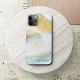 An elegant phone case with a gold, teal and gray watercolor effect abstract pattern. In the bottom left corner of the phone, in script dark gray typography, you can easily customize with your name.