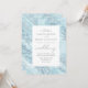 This elegant wedding invitation features a pastel blue marble background with silver faux glitter veins. The customisable charcoal grey text is framed by a white rectangle. The marble design is repeated on the reverse.