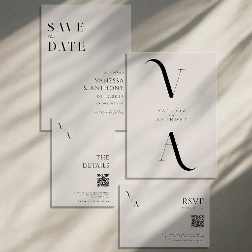 Modern Minimalist Black and Ivory Wedding Invitation. Features elegant monogram typography and minimal graphic design. Personalise text with all the details of your special day.