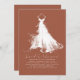 Indulge in a bridal shower invitation that is a true manifestation of feminine grace and refinement, highlighted by a beautifully rendered white wedding gown. The design is imbued with a romantic and intimate allure, beckoning the viewer to immerse themselves in its depth. It artfully portrays the spirit of a bride brimming with love, her aspirations and dreams delicately woven into the fabric of the dress's silhouette. The invitation's typography merges subtlety with elegance, complementing the hand-drawn, pencil-sketched illustration that contributes layers of whimsical charm, tender beauty, and a uniquely personal essence. Set against a terracotta backdrop, this invitation becomes a versatile treasure, seamlessly adaptable to any bridal shower theme, whether you envision boho chic, urban contemporary, rustic charm, timeless elegance, or an autumnal vintage romance. Exuding feminine sophistication and allure, this burnt orange invitation is designed to create a lasting and unforgettable impact on every recipient.
