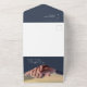 This all-in-one invitation features an elegant modern minimalist style with beautiful calligraphy script wording, "the wedding of" and photo and qr code on a navy blue background. The simplicity of this design adds a touch of elegance to your wedding. It works well with many wedding themes and definitely a great addition to your wedding. Just customise the names and wording in a few easy steps and personalise the all-in-one invitation card with your photo of the happy couple and replace the QR Code with yours to give your invitation a nice personal touch. This invitation will save you money to send everything at once. It has a perforated RSVP postcard can be easy to tear off and your guest just sends it to you. Just simply fold each card into the outlined shape -- seal and send to your guests. No envelope is needed for shipping -- just postage.
