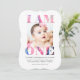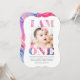 Modern swirls of pink, purple and blue lettering "I AM ONE" highlight the photo of your baby's 1st birthday invitation. Available in other colour combinations you can easily add you party details to this first birthday invitation template.
