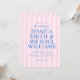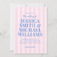 Create your own personalised wedding invitations featuring modern typography in blue colour with striped pink pattern background