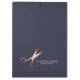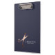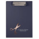 Modern and elegant design for hairstylists with faux rose gold scissors, elegant calligraphy font and navy blue background.