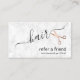 Modern and elegant design for hairstylists with faux rose gold scissors, elegant calligraphy font and white marble background.