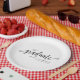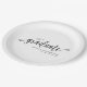 Elegant modern script graduation party paper plates. These paper plates feature a simple black and white theme with an elegant font. Add the graduates name and high school or college for the perfect personalised graduation party paper plates.