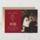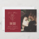 Simple, modern script, minimalist, red postponed wedding invitation, with elegant gold rose flower drawing art.