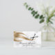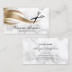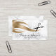 Beautiful hairstylist business card design with gold faux metallic texture hair, scissors, white marble background and elegant calligraphy font.