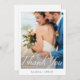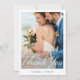 This simple, elegant photo wedding thank you flat card template features a chic, modern design. We've chosen an elegant script that also has a warm, personal flair for 'thank you' on the front. This part of the design cannot be altered. Just below that, we've added 'for celebrating with us!' This makes this card particularly well suited to expressing your thanks specifically to those who were able to attend your wedding party. But you can delete or perhaps edit this line of text so that it expresses a more general sentiment that also applies to those who gave a gift but couldn't attend your wedding party, if you prefer! You can change the colour and font of the text for your names beneath the photo as well as the text on the back to suit your style. This includes the option of changing the '+' symbol between your names to 'and' or '&' if you prefer. On the back we've set the background as transparent to let the colour of the paper simply serve as the base tone. But you can change this by picking a colour in the editing tools if you'd like. And we've picked a colour that's a dark grey that is mostly black as the default colour for the text on the back. This is the same tone we chose for your names on the front. We've put some sample text on the back for you to replace with your own message as you see fit, but please don't feel restricted by this. If you prefer delete our placeholder text and then keep the back totally blank so that you can write a handwritten note on each card instead, you can do that. Or you might want to replace our text with your own message of gratitude and your own closing and then hand sign your names when you receive the cards. You can also change the font and you might change the case from the all upper case look we added. Just please be sure in any event to delete our sample/placeholder text on both sides of the card, and please remember to replace the sample photo on the front with your own. Use the intuitive design tools, your favourite photo and your inspiration and make this elegant photo wedding thank you card uniquely yours!