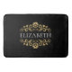 An elegant black and gold flourish monogram bath mat. Add your name between the gold floral flourish on the front. Designed for you by Blackberry Boulevard.